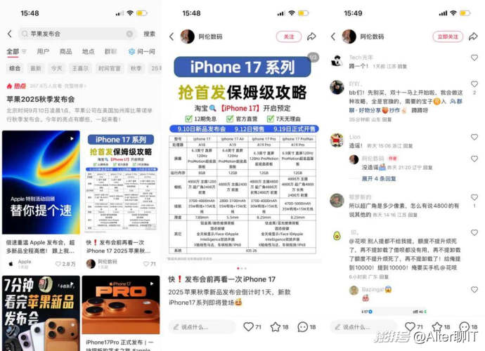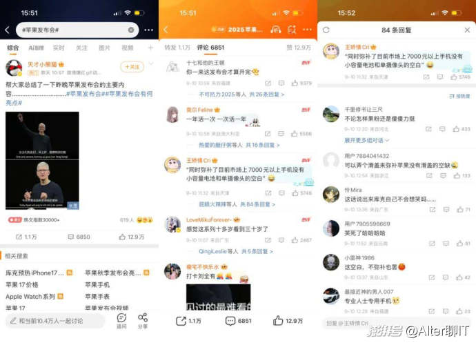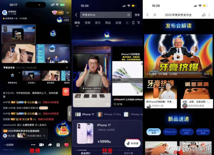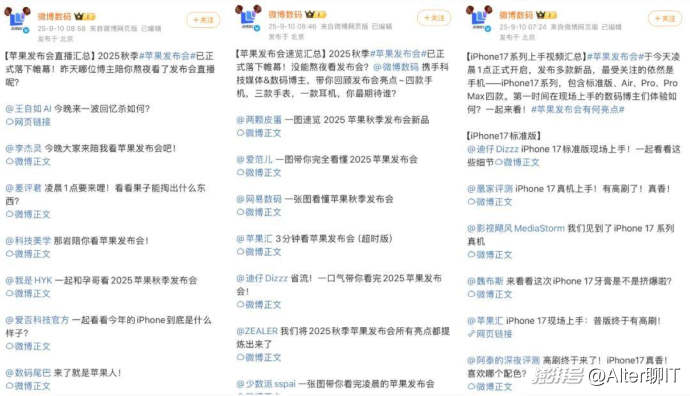 其中微博數碼在蘋果發布會前一天就組織了“大V報道團”,和多位KOL連線實時解讀發布會內容;在發布會結束后,送上了一波長圖和視頻“速覽”,并針對iPhone 17系列、新款Apple Watch、AirPods Pro 3等產品第一時間輸出了上手視頻和專業解讀。