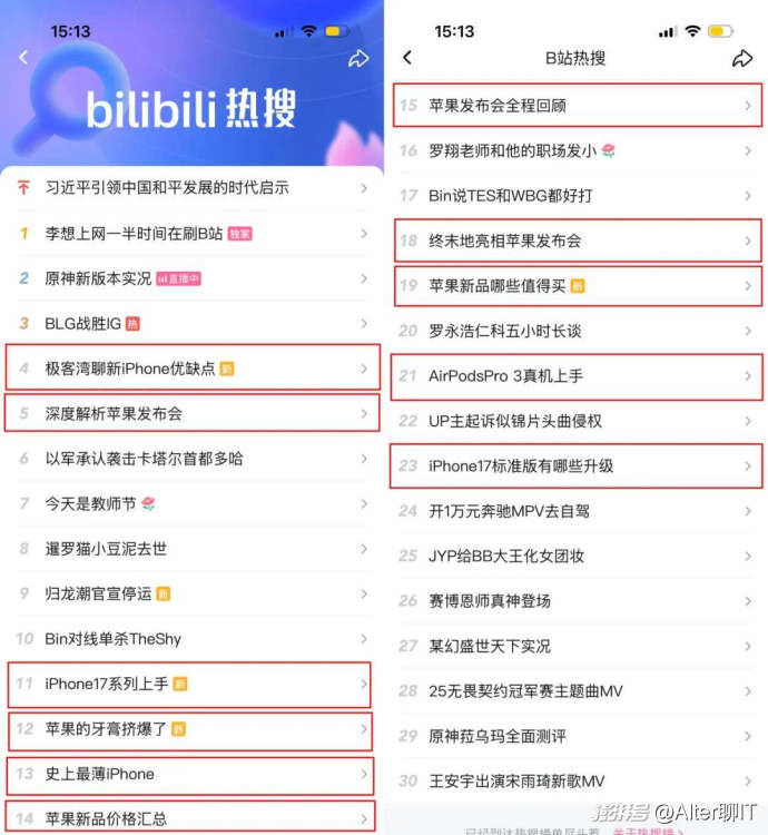 B站熱搜呈現出了“蘋果發布會”霸榜的態勢,相關話題占比超過了三分之一,包括深度解析、上手體驗、價格匯總等不同維度。B站的話題衍生和跨圈能力稍弱,但“圈內”的技術濃度和質量極高,維持了更長時間的關注度,也讓UP主有時間去打磨內容。