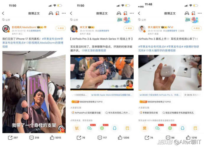 來自數碼領域的KOL,將原本單一、零散的事實信息整理成了有深度、有條理的分析和觀點,滿足了用戶“知其然”后,更想“知其所以然”的需求。比如微博聯合現場博主圍繞用戶關注的功能和賣點,上手體驗了iPhone17、AirPods Pro 3等產品,傳遞出了更多的增量信息。