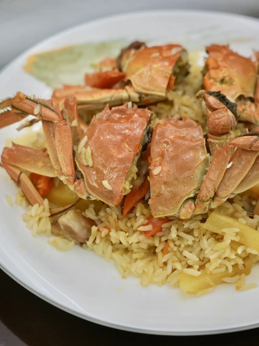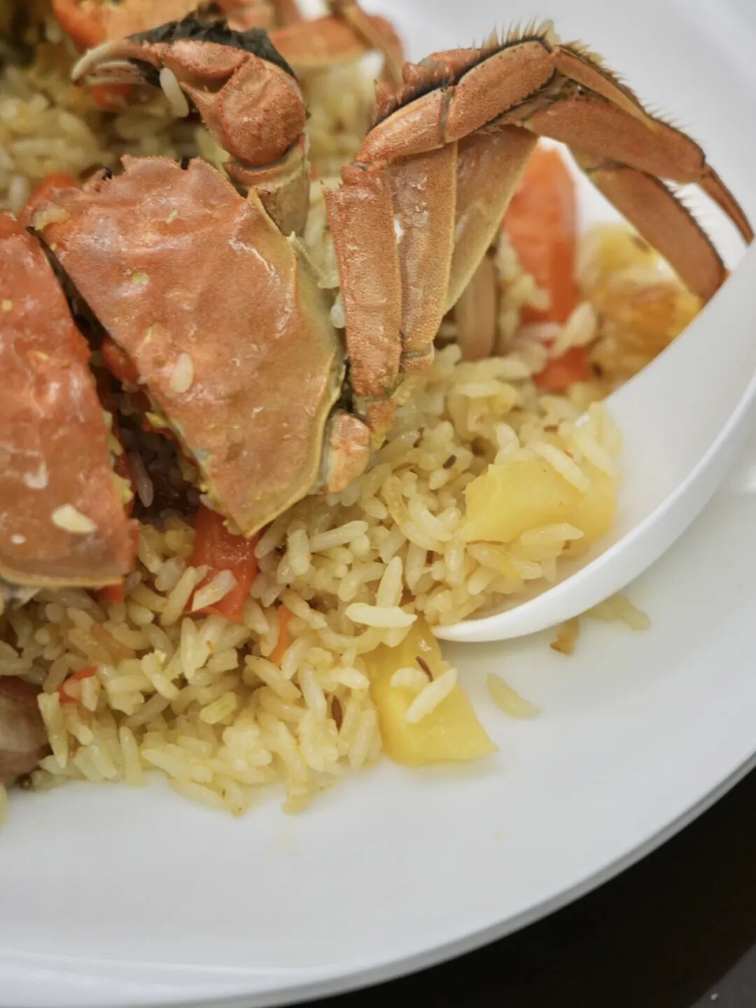 米飯松散油亮,上面蓋著螃蟹。抓飯本身的就讓人欲罷不能,而有了螃蟹的參與后,更多了份富饒感。