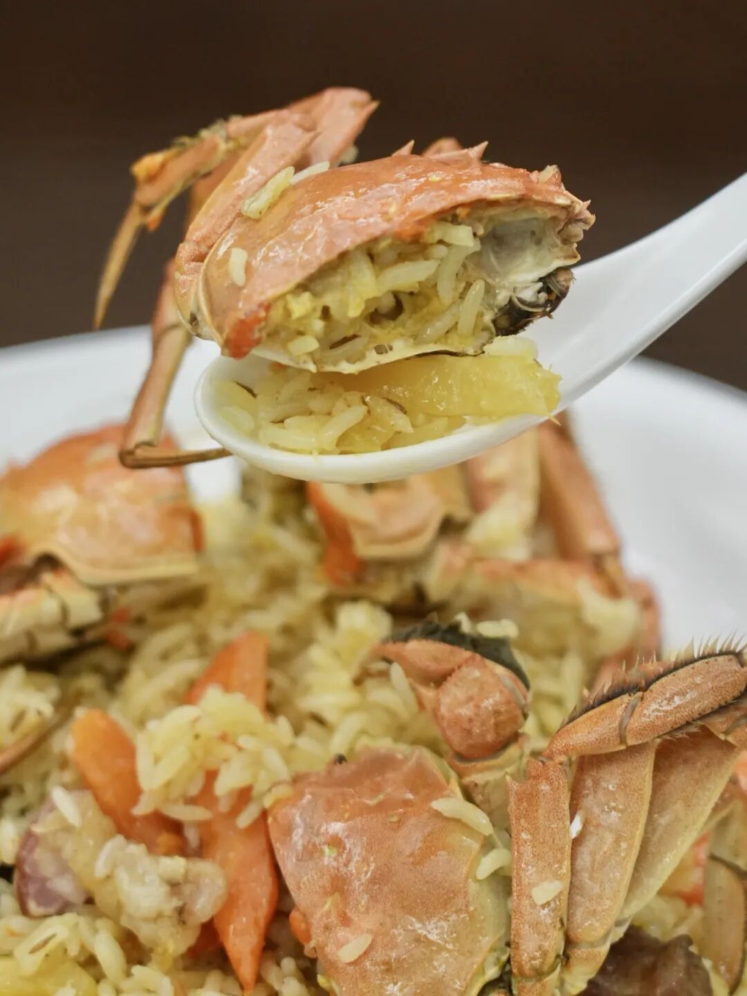 聽廚師朋友說,螃蟹抓飯究其本質(zhì)是“蒸”,在做抓飯的基礎(chǔ)上加入蟹,蒸出來的蟹流出鮮甜汁水,緩緩滲入每一粒米飯之中。