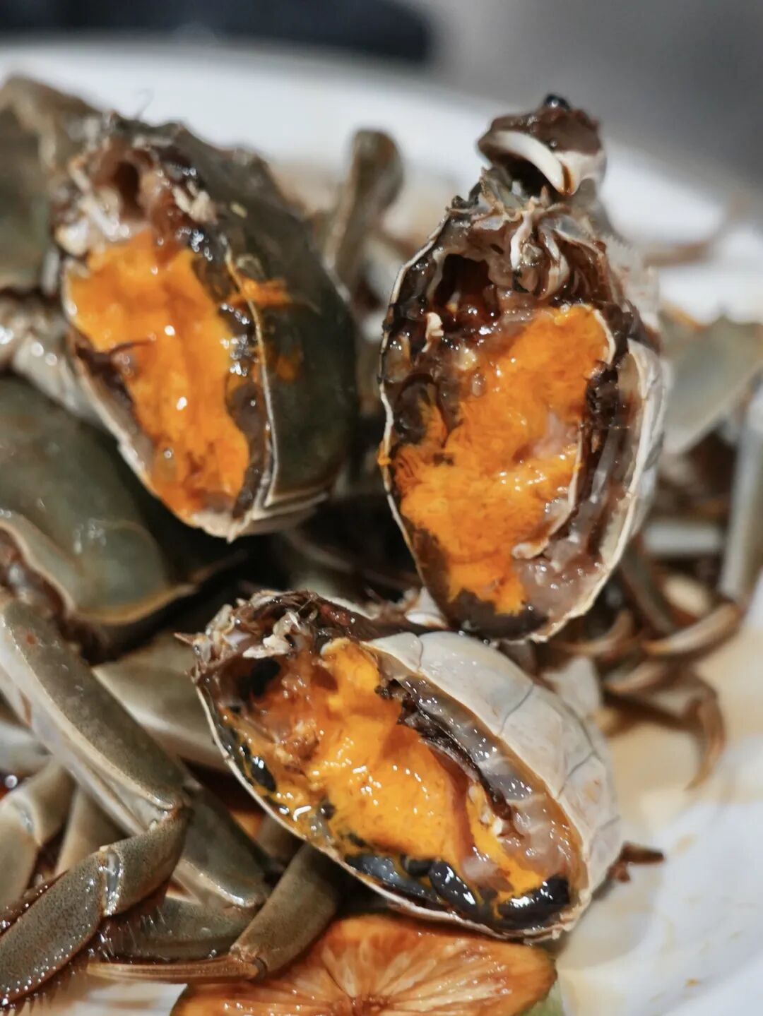 蟹身趁熱吃。蒸熟后的蟹膏呈半透明的膠質(zhì)狀,口感軟糯,回味甘甜。蟹黃則有著鮮艷的橙紅色,口感更妙,細膩滑潤得像流沙,鮮香在唇齒間久久不散。