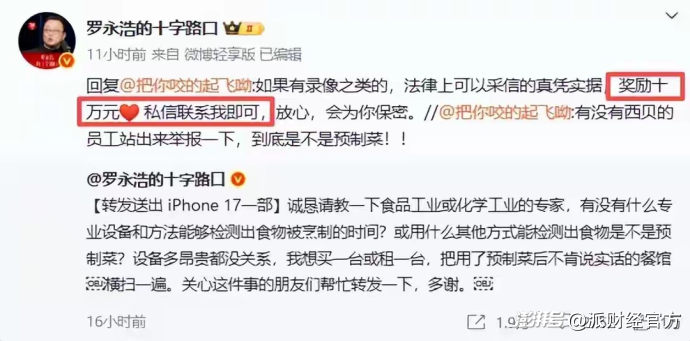 隨后,羅永浩還發起10萬元懸賞,公開征集西貝使用預制菜的“真實證據”。