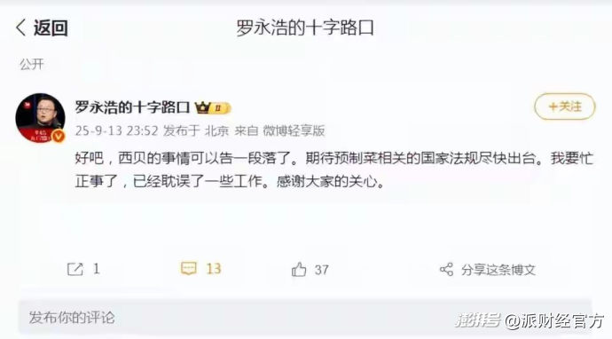 9月13日晚,羅永浩微博最新發文稱西貝的事情可以告一段落了,全文如下: