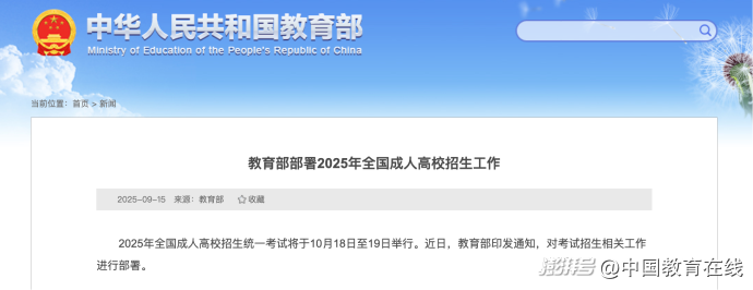 2025年全國成人高校招生統一考試將于10月18日至19日舉行。近日,教育部印發通知,對考試招生相關工作進行部署。