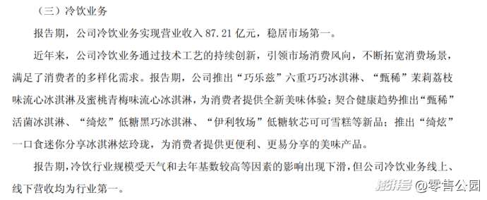 一般而言,消費者更傾向于在炎熱夏季選購冷凍飲品,進入寒冷的秋冬季后,對這類產品的購買意愿會顯著降低。比如,2024年財報顯示,伊利冷飲業務營收87.21億元,同比驟降18.4%,主要系“天氣和去年基數較高等因素的影響”。
