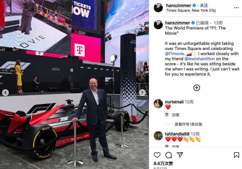△ 漢斯·季默參加電影《F1:狂飆飛車》首映禮