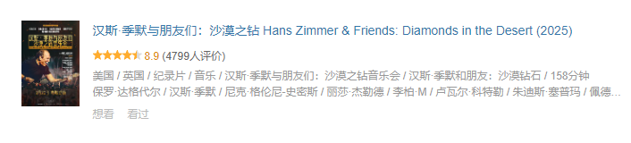 《漢斯·季默與朋友們:沙漠之鉆》在豆瓣評分高達8.9分,但上映首日全國排片占比僅0.4%,且仍在下降中。