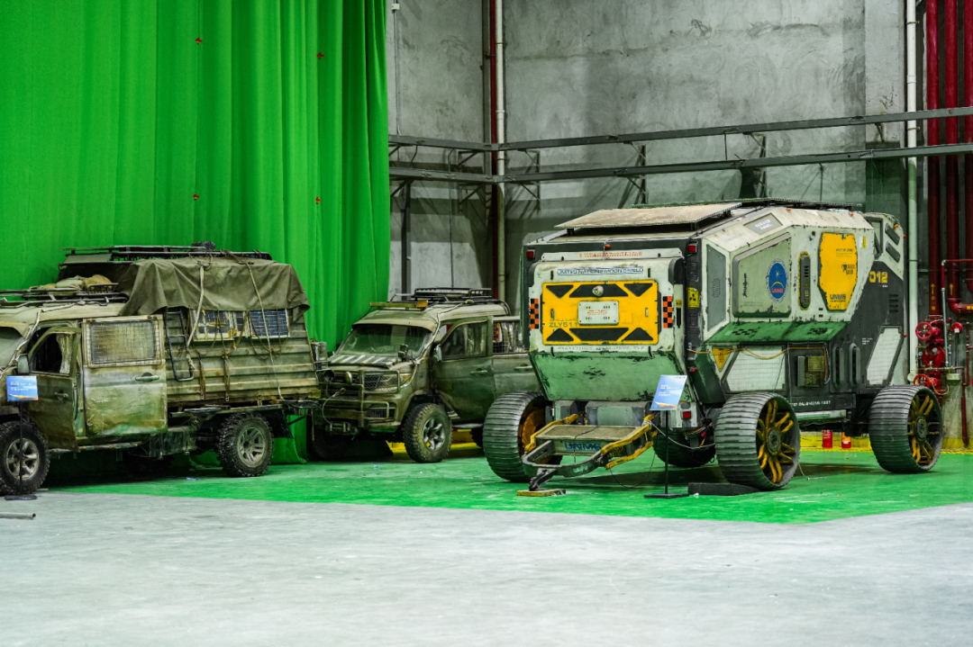 這個(gè)工場(chǎng)里,堆滿了《獨(dú)行月球》等大制作科幻電影留下的工業(yè)級(jí)道具 —— 月球車、空間站內(nèi)景、火星地表裝置等。