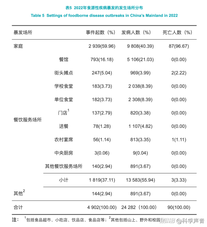很多人一看到食品安全的新聞,第一反應(yīng)就是“外面的餐廳不安全,還是家里吃放心”。但這種印象,其實(shí)存在巨大的“幸存者偏差”。讓我們看看統(tǒng)計(jì)結(jié)果。根據(jù)中國疾病預(yù)防控制中心發(fā)布的《2022 年全國食源性疾病暴發(fā)監(jiān)測數(shù)據(jù)》,在所有暴發(fā)食源性疾病的場所中,家庭占了事件總數(shù)的 59.96%,餐館是 21.03%,死亡人數(shù)的比例就更懸殊了,在家中吃死的人數(shù)占比 96.67%,而在餐館中吃死的是零,有沒有震碎三觀?