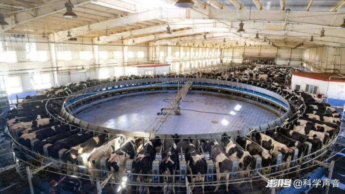 奶牛集體在大型轉(zhuǎn)盤式擠奶機(jī)上擠奶。圖源:新疆網(wǎng)