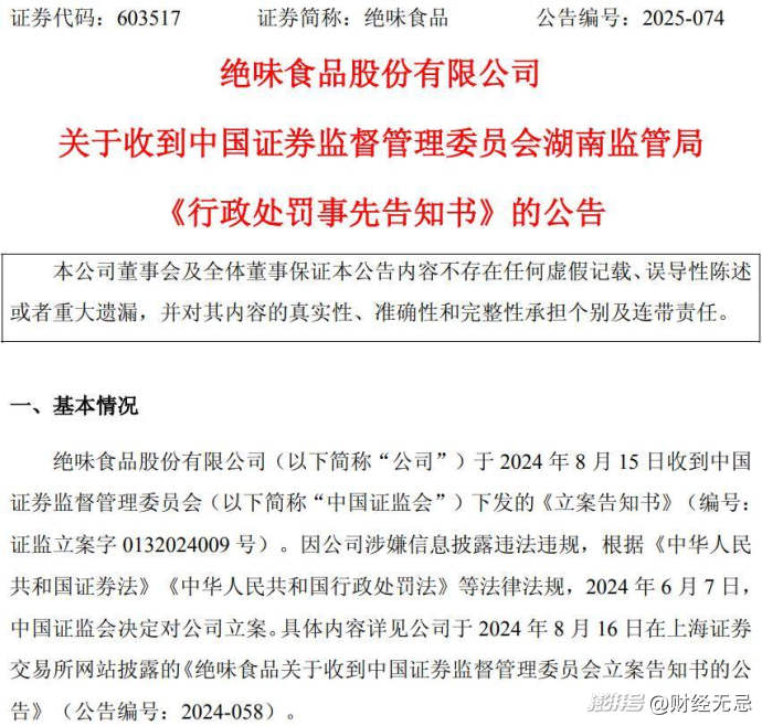 中國證監(jiān)會(huì)湖南監(jiān)管局決定對絕味食品責(zé)令改正、給予警告,并處以400萬元罰款;