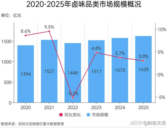 紅餐產(chǎn)業(yè)研究院數(shù)據(jù)顯示,2024年鹵味品類市場規(guī)模為1573億元,同比增速僅為3.7%;預(yù)計(jì)2025年將微增至1620億元,增速進(jìn)一步放緩。