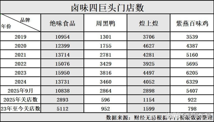 而同一時(shí)期的周黑鴨、煌上煌和紫燕百味雞,各關(guān)店952家店、1599家店、798家店,四家鹵味巨頭,合計(jì)關(guān)店8461家。