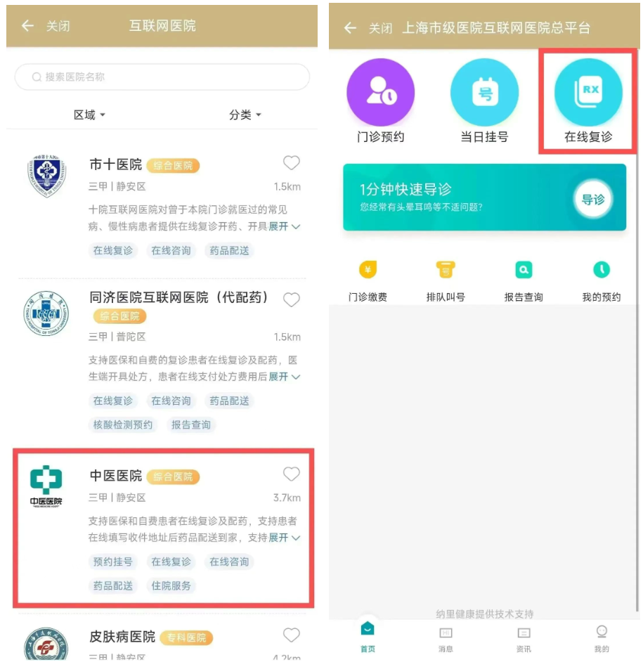 第二步:搜索想去的醫(yī)院,也可按條件進(jìn)行篩選,隨后點(diǎn)擊進(jìn)入醫(yī)院服務(wù)頁面,選擇對應(yīng)的復(fù)診服務(wù)(以上海中醫(yī)醫(yī)院線上復(fù)診為例)。