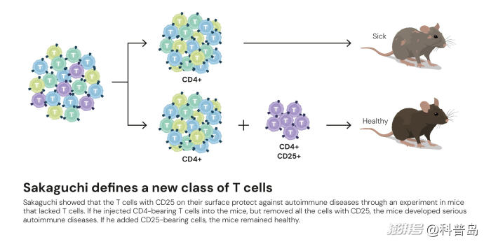 在缺乏T細胞的小鼠實驗中,他發現:如果給這些小鼠注入攜帶CD4的T細胞,但同時去除所有攜帶CD25的細胞,小鼠就會發展出嚴重的自身免疫性疾病。