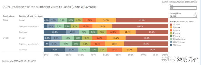 “去中心化”與“深度體驗化”的融合,使日本旅游呈現(xiàn)出遠(yuǎn)高于傳統(tǒng)模式的復(fù)購特征。JINTO數(shù)據(jù)顯示,2024年中國游客中首次訪日者占比為41.9%,高于全球平均的34.3%。更值得注意的是,有10.7%的游客曾三次以上赴日旅游,甚至有6%的游客選擇二十次及以上。