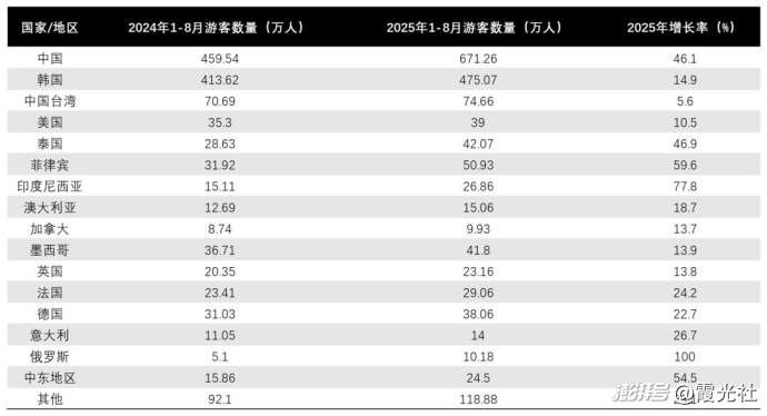 從客源結(jié)構(gòu)來看,日本入境游市場呈現(xiàn)全域增長、新興市場爆發(fā)的強勁態(tài)勢:印尼以77.8%的同比增速領(lǐng)跑,俄羅斯增幅更達(dá)100%,實現(xiàn)翻倍。菲律賓(+59.6%)、中東地區(qū)(+54.5%)、泰國(+46.9%)與中國大陸(+46.1%)同樣增長迅猛,增速均超45%。意大利(+26.7%)、法國(+24.2%)、德國(+22.7%)等歐洲國家,維持了超過20%的穩(wěn)健增長。