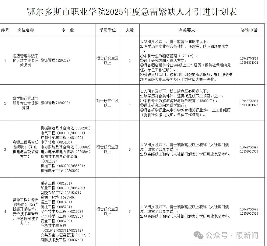 報考咨詢電話:0477-8396790/8390300(手機號詳見《鄂爾多斯職業學院2025年度急需緊缺人才引進計劃表》)
