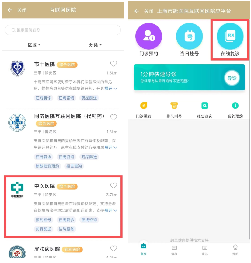 第二步:搜索想去的醫(yī)院,也可按條件進(jìn)行篩選,隨后點(diǎn)擊進(jìn)入醫(yī)院服務(wù)頁面,選擇對(duì)應(yīng)的復(fù)診服務(wù)(以上海中醫(yī)醫(yī)院線上復(fù)診為例)。