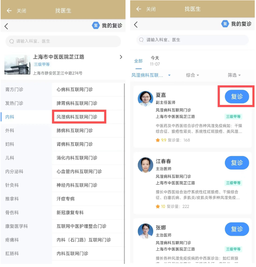 第三步:選擇對(duì)應(yīng)的科室以及醫(yī)生,點(diǎn)擊“復(fù)診”按鈕(以上海中醫(yī)醫(yī)院“風(fēng)濕病科互聯(lián)網(wǎng)門診”線上復(fù)診為例)。