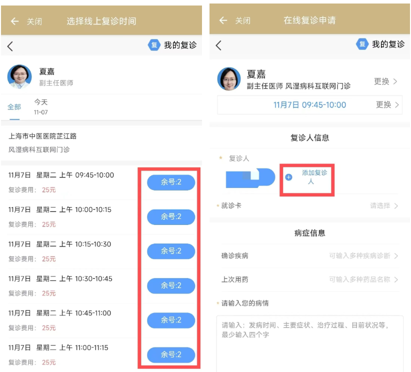 第四步:可點(diǎn)擊右方藍(lán)色按鈕,預(yù)約對(duì)應(yīng)的時(shí)間段,進(jìn)入預(yù)約頁面后請(qǐng)點(diǎn)擊“添加復(fù)診人”并按照提示填入信息。