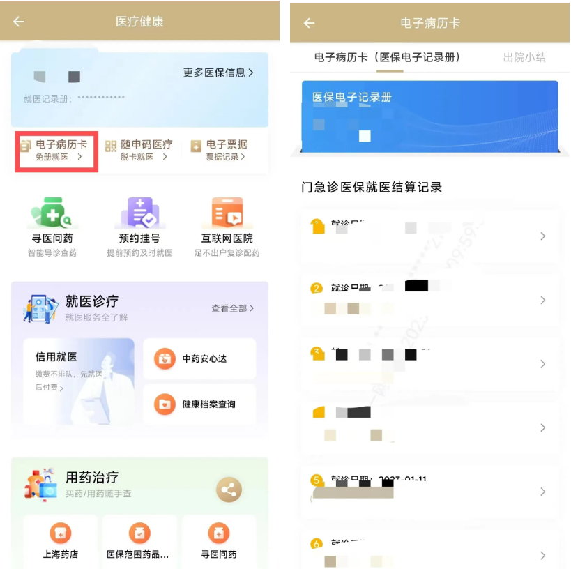 電子病歷卡:點(diǎn)擊進(jìn)入【電子病歷卡】服務(wù),即可查看你的醫(yī)保電子記錄冊(cè),查看往期門急診醫(yī)保就醫(yī)結(jié)算記錄。