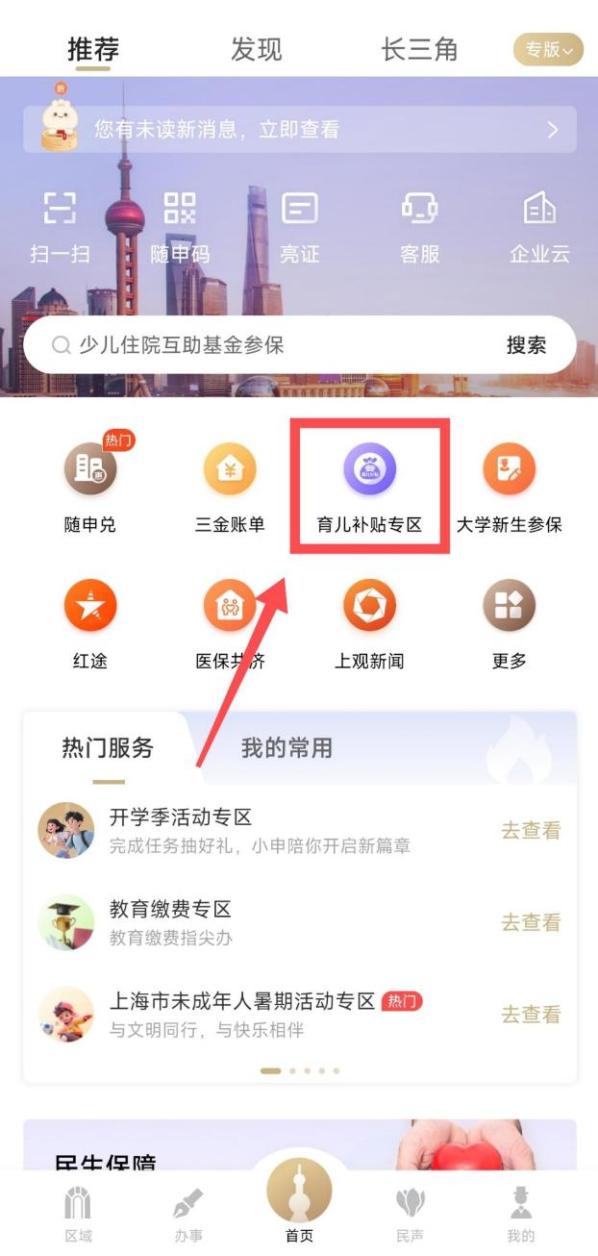 進入方式:打開“隨申辦市民云”APP,點擊首頁“育兒補貼專區”圖標或搜索欄搜索“育兒補貼專區”點擊進入即可。