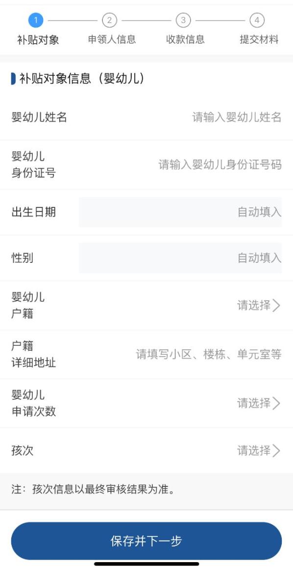 點擊“立即申領”按鈕,跳轉進入申領頁面,按照文字提示填寫補貼對象相應信息,點擊“保存并下一步”按鈕。