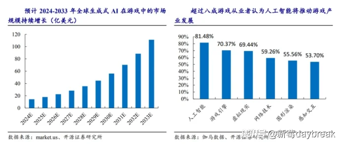 根據(jù)market.us的測(cè)算,2024年全球生成式AI在游戲領(lǐng)域的市場(chǎng)規(guī)模為14.3億美元,預(yù)計(jì)到2033年將增長(zhǎng)至111.1億美元,期間年復(fù)合增長(zhǎng)率高達(dá)25.6%。