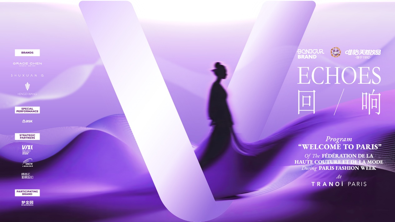 2025年10月4日,由Bonjour Brand中法品牌美學中心主辦,四川唯怡飲料食品有限公司作為首席合作伙伴聯合呈現的時尚藝術項目Bonjour Echoes在巴黎布隆尼亞宮盛大啟幕。作為巴黎時裝周Welcome to Paris的官方EVENT活動,Bonjour Echoes繼2024年后再次以集體形式將中國原創設計力量帶入國際頂級時尚舞臺。三大核心走秀品牌GRACE CHEN、SHUXUAN G.、HENGDI WANG登場,向世界展示來自東方的美學創造。