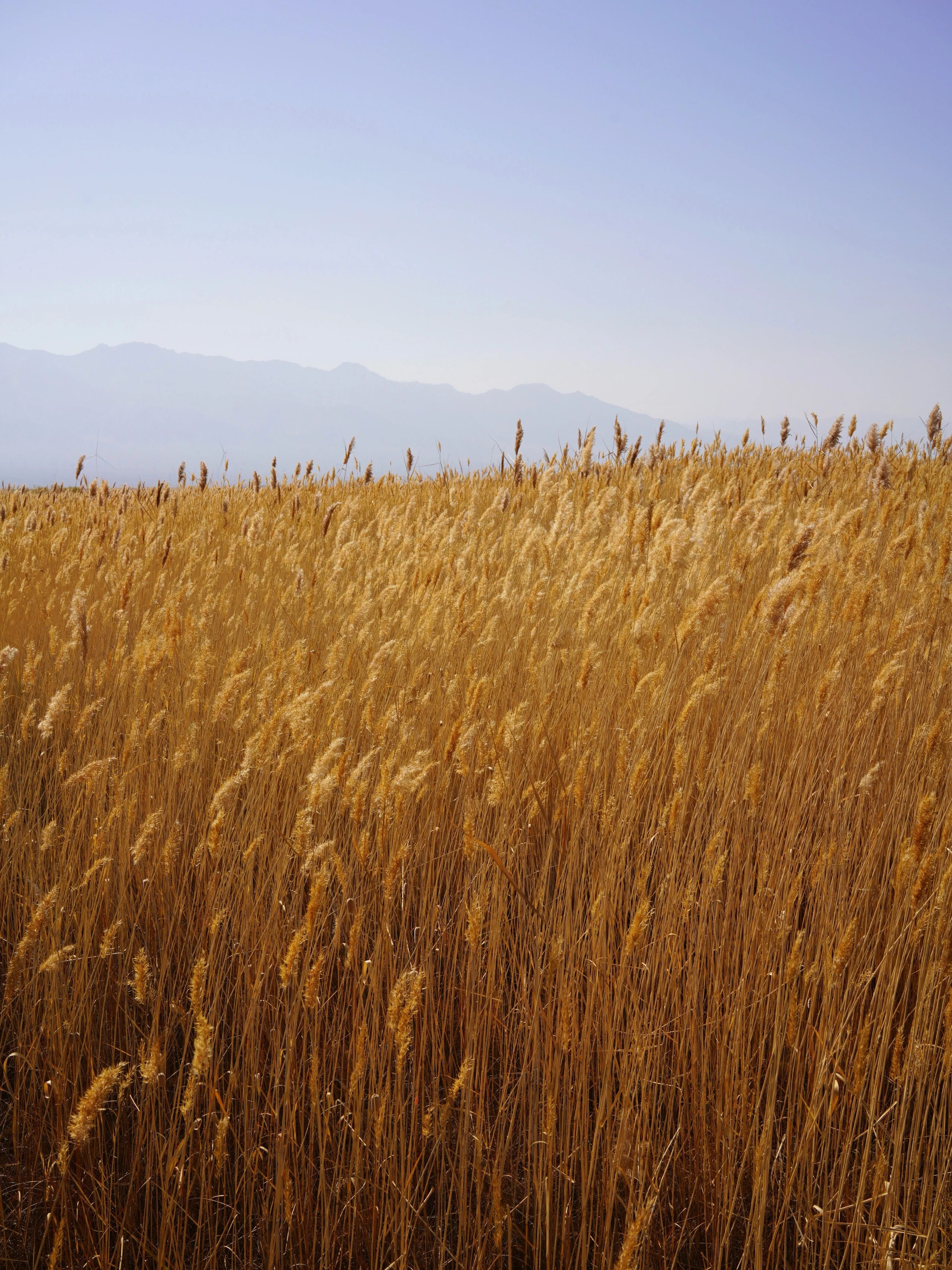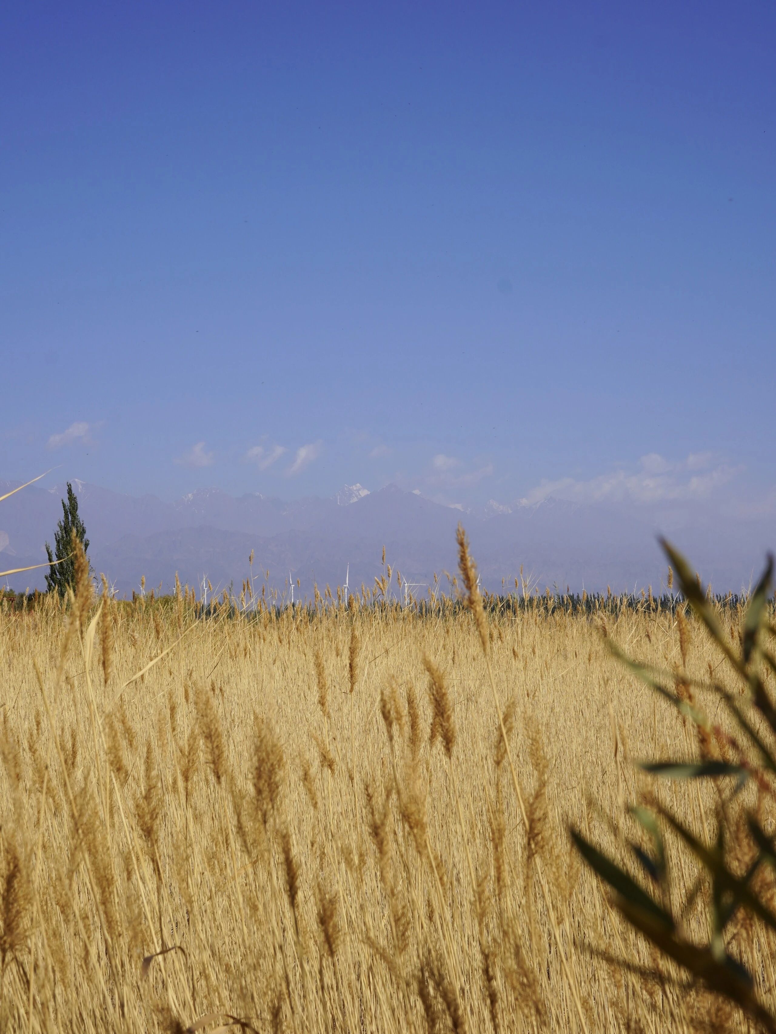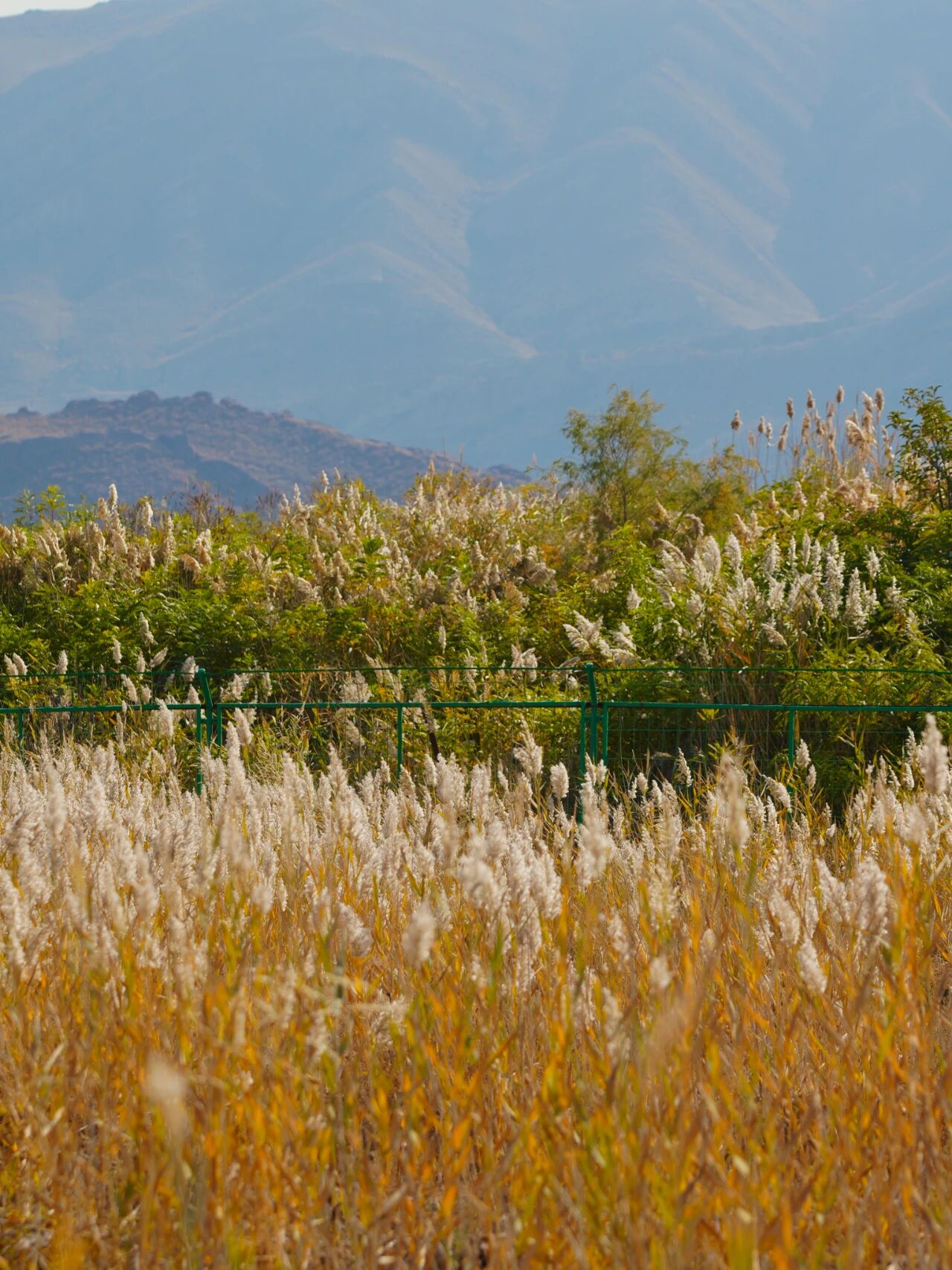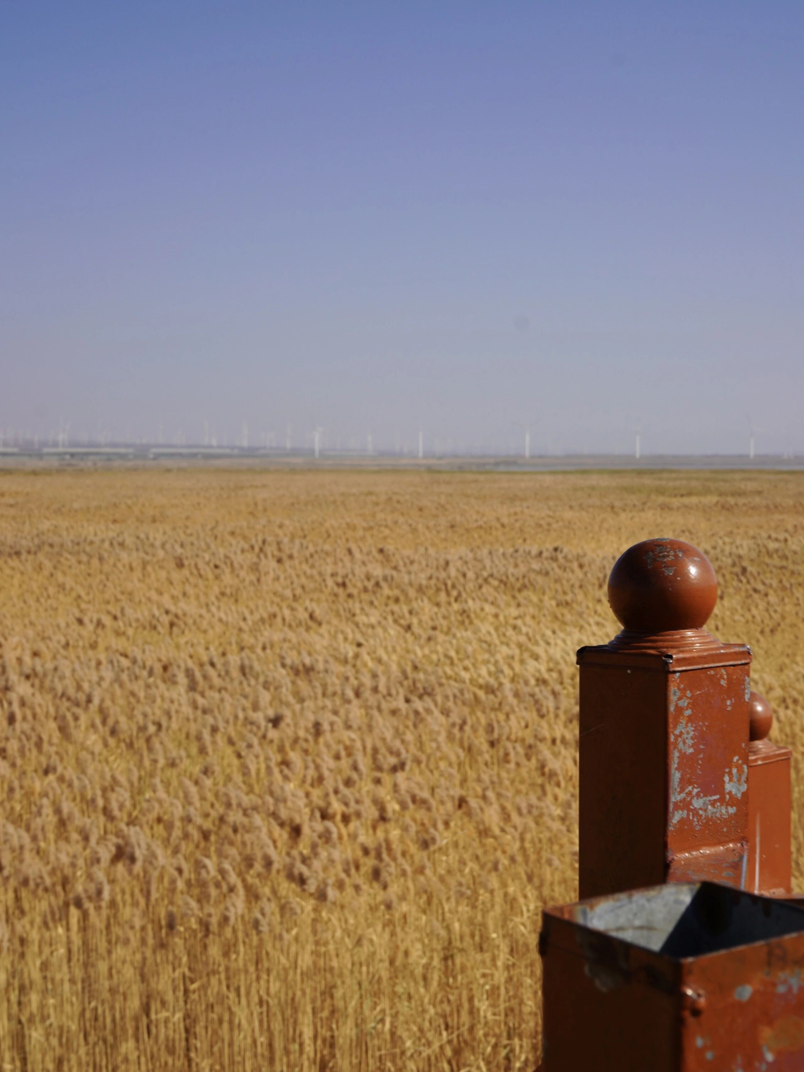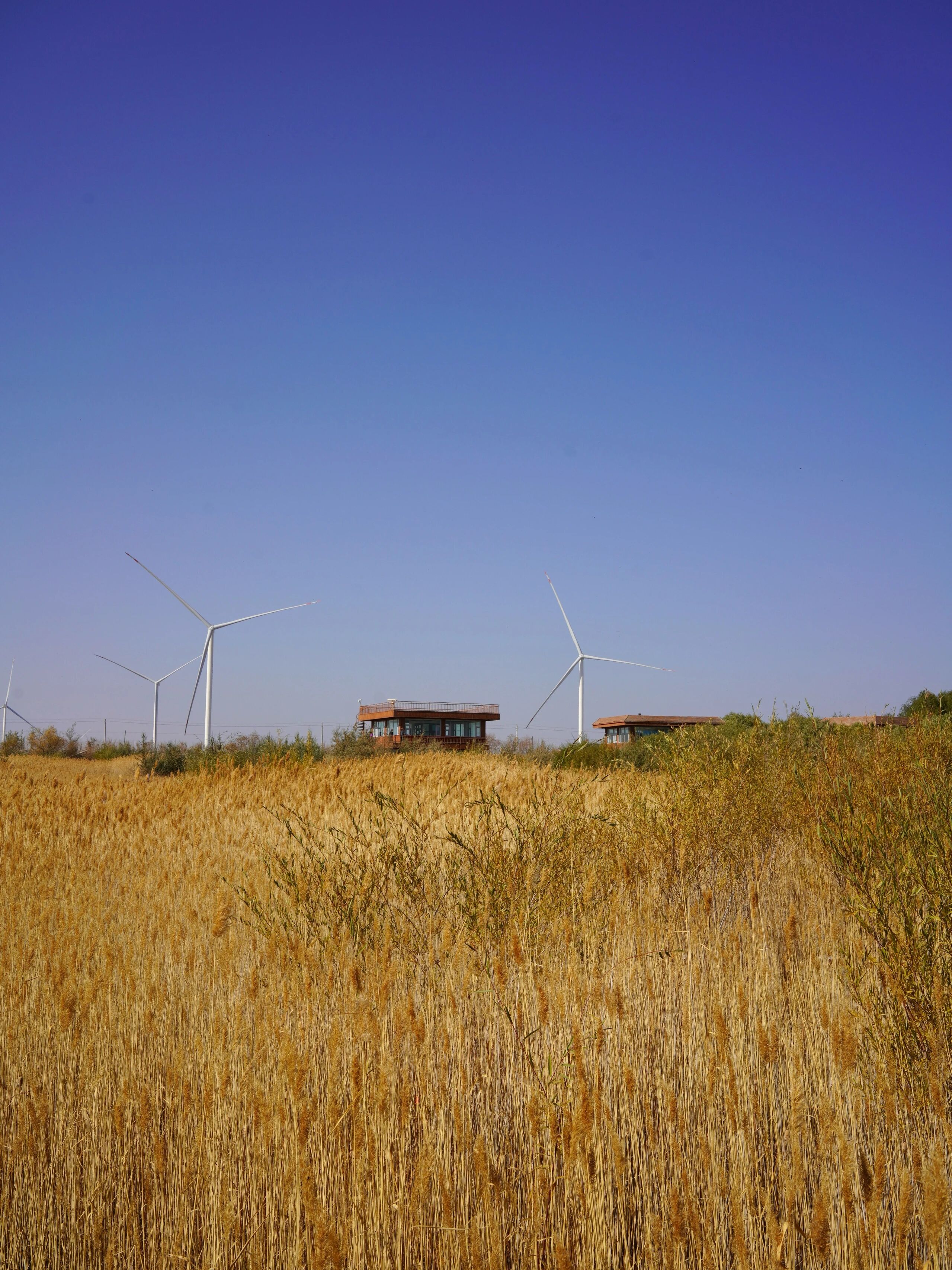 遠處,雪山像是披了一層輕紗,風力發電的風車悠然轉動;近處,金色蘆葦觸手可及。一近一遠,一微觀一宏觀,趣意盎然。