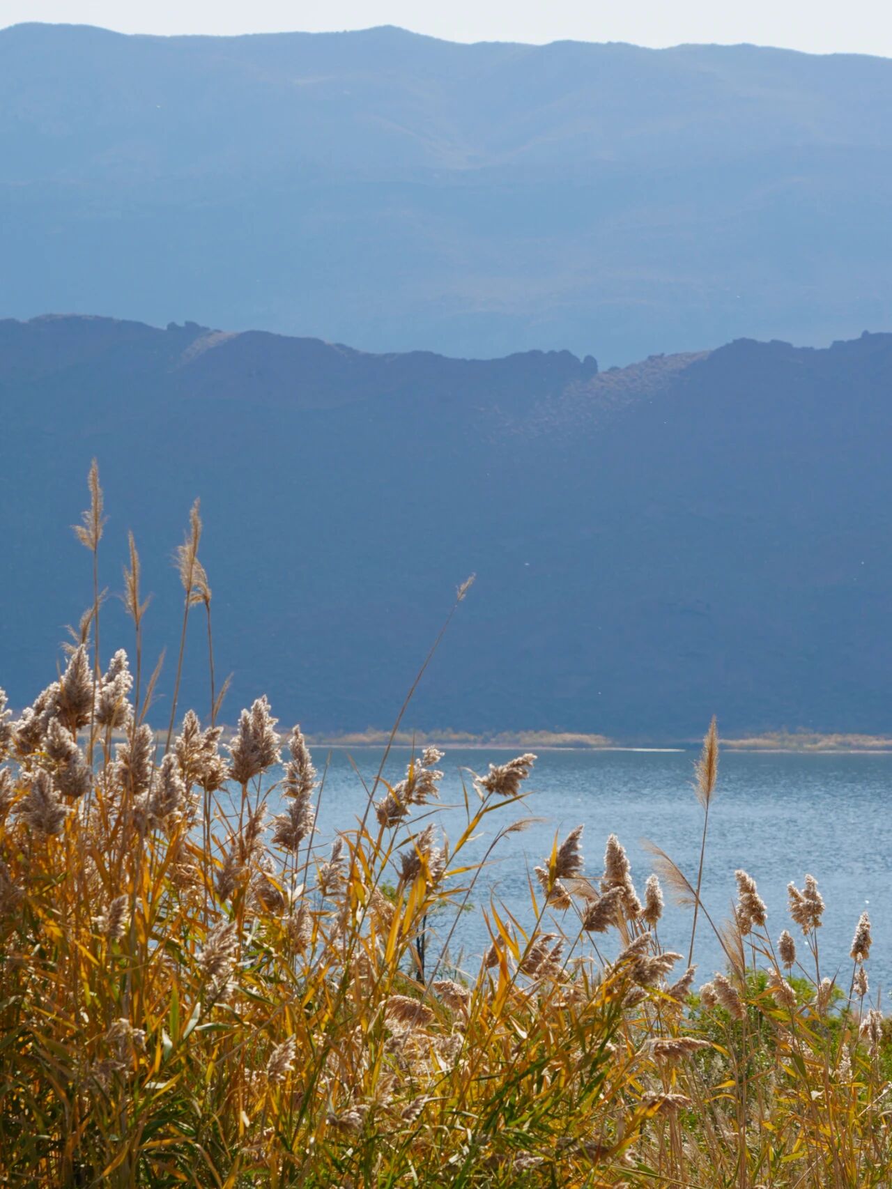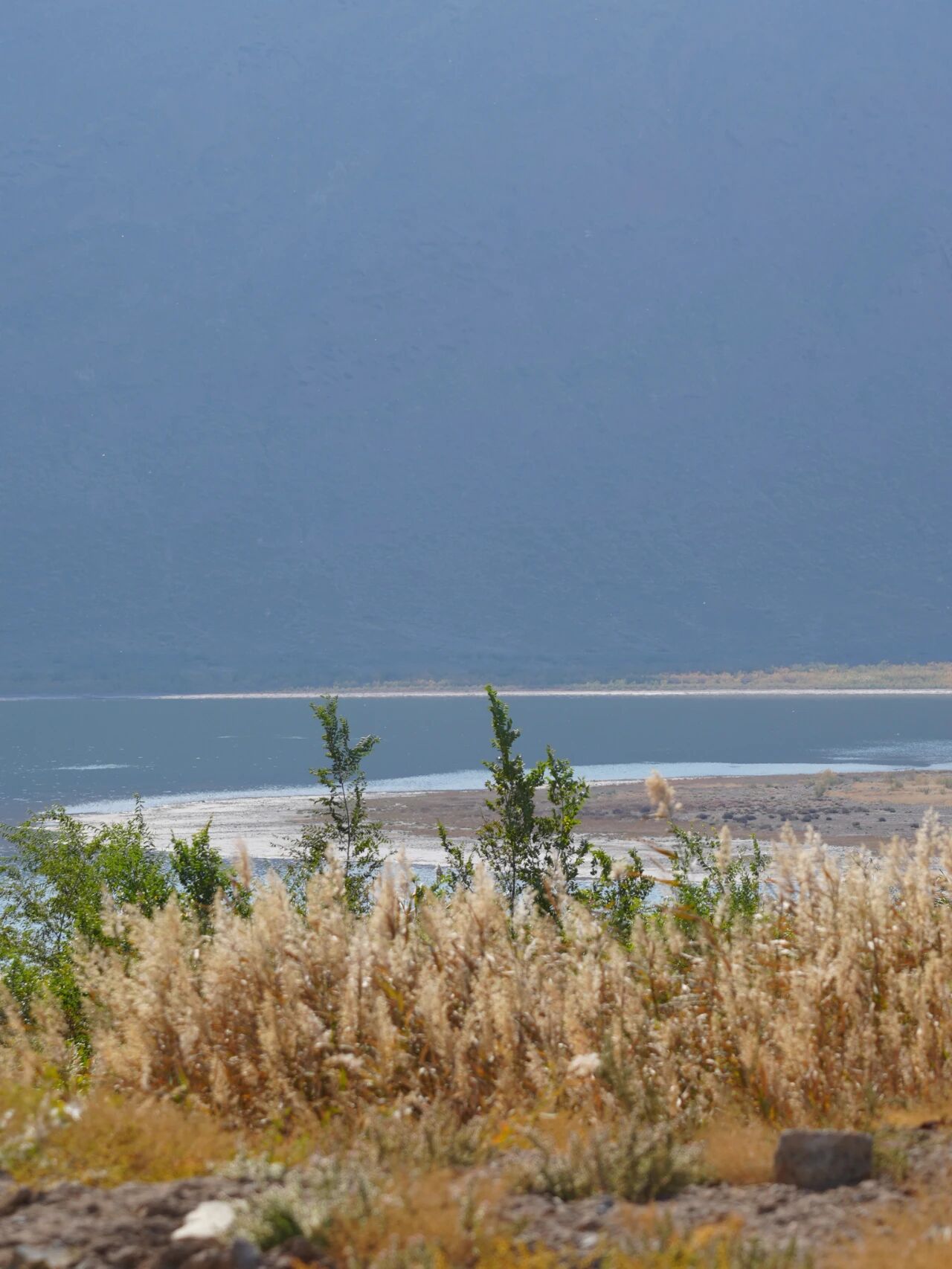 近處秋草黃綠相間,湖水如碎銀鋪展,遠山朦朧如黛,偶爾可以看見天上飛鳥。