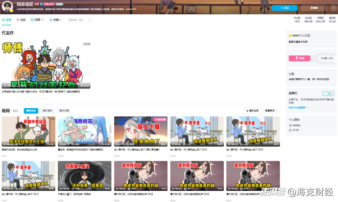 即便是看似粗糙的動畫制作,也能憑借深度特色內容吸引用戶。比如目前在B站擁有499萬粉絲的UP主“圓桌動漫”,日常發布的內容即為網文改編的動畫短劇,即便線條式Q版畫風簡單,甚至有點像PPT,仍獲得了眾多用戶的喜愛。UP主主頁顯示,當前充電付費人數達11.4萬人。按照每月15元的充電金額計算,這項收入已達171萬元。而UP主的充電排行榜可見,已有超過100名用戶為之充電超過1年時間。