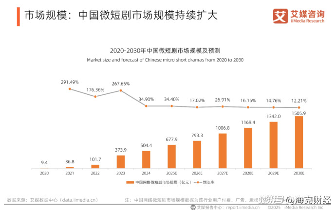 根據國家廣電總局定義,微短劇是單集時長從幾十秒到15分鐘左右,有相對明確主題和主線的網絡劇集。自2020年國家廣電總局將網絡微短劇板塊納入備案系統,微短劇便邁入高速發展軌道。據調研機構艾媒咨詢數據,國內微短劇市場規模自2020年的9.4億元已增長至2024年的504.4億元,預計2025年達677.9億元,2030年將超過1500億元。