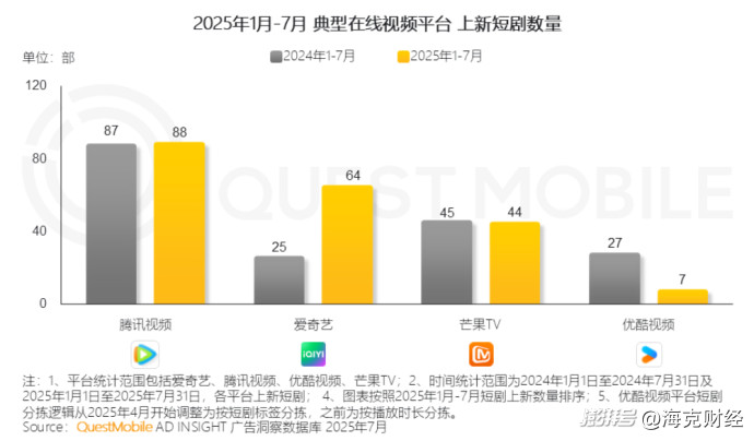 調研機構QuestMobile數據顯示,2025年1-7月,騰訊視頻、愛奇藝、芒果TV、優酷上新橫屏微短劇數量分別為88部、64部、44部、7部;同比2024年1-7月,騰訊視頻、芒果TV數量相仿,愛奇藝從25部驟增至64部,優酷則從27部降至7部。也就是說,自2024年至今,除優酷上新30余部外,騰訊視頻、芒果TV、愛奇藝的微短劇數量都在百部級別。