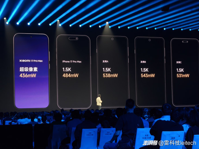 按照發(fā)布會(huì)上公布的數(shù)據(jù),小米 17 Pro Max 上采用超級(jí)像素技術(shù)的 1.5K 5.9 英寸 OLED,屏幕功耗在 436mW,相比分辨率同樣 1.5K 左右的 iPhone 17 Pro Max 以及其他機(jī)型,功耗明顯更低。