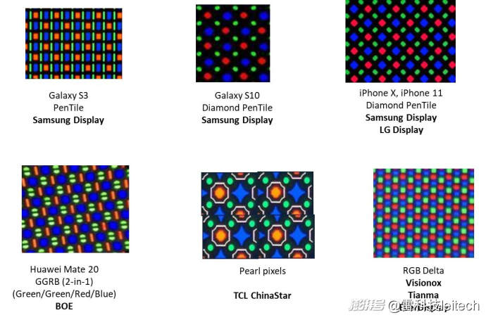 這樣一來,屏幕廠商能在不增加物理像素?cái)?shù)量的前提下提高亮度、延長(zhǎng)壽命——尤其是藍(lán)光壽命短的問題。但代價(jià)是,實(shí)際顯示的細(xì)節(jié)密度其實(shí)低于標(biāo)稱分辨率。而不管是早期的 PenTile、2 in 1(俗稱「周冬雨排列」)還是后來的 Diamond 鉆石排列,雖然效率和顯示效果都有了明顯地改進(jìn),但并沒有改變本質(zhì)問題。