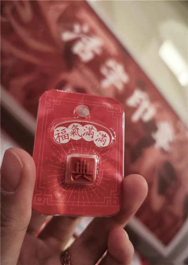 走出夜市,向西南1.5公里的黨河河畔,就是敦煌印局。負一層有一面活字印章墻,在一柜20行第六個,記者通過掃碼找到了自己的名字,一只包裝秀麗的反體字,上面寫著“福氣滿滿”。