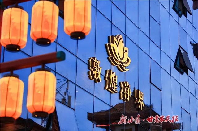 同樣在敦煌夜市中段,近日火了一處特別的打卡點——敦煌凈界。藍色豪華大氣的門頭,兩層玻璃幕墻,進門就仿佛來到了一個神秘的石窟,不禁讓人懷疑它真的只是一個衛生間?