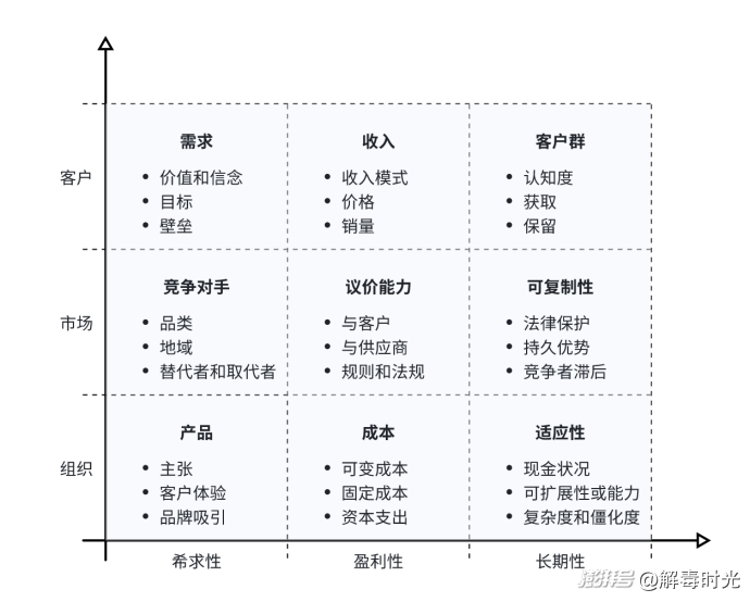 在《網(wǎng)格決策-商業(yè)成功背后的關鍵模型》這本書中,有一套3*3的網(wǎng)格矩陣,對于思考企業(yè)在行業(yè)中發(fā)展的戰(zhàn)略很有幫助。這個模型把市場分為客戶、市場、組織(自身)三個組成部分,同時對應了三種特性,即希求性(desirability)、營利性(profitability)和長期性(longevity)。