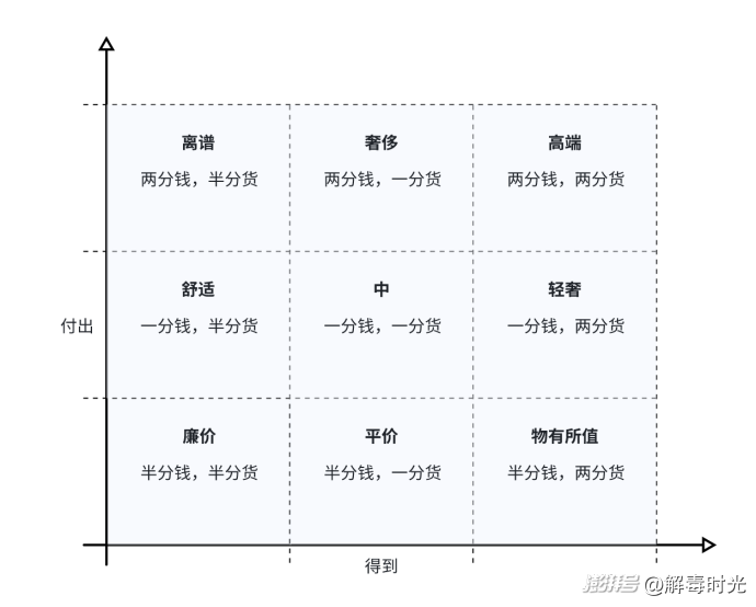 這兩個維度非常簡單,即消費者的付出和得到。每個維度都可以分為低中高三個檔次,為了便于理解,我們可以說,消費者花了半分錢、一分錢、兩分錢,得到了半分貨、一分貨、兩分貨。這樣形成的九宮網(wǎng)格里,就能夠看出產(chǎn)品的一些特性,比如經(jīng)常所說的一分錢一分貨,就居于這個體系的最中間;花半分錢得到半分貨的是廉價品,花兩分錢得到兩分貨的是高端品;花兩分錢得到一分貨的是奢侈品;花半分錢得到一分貨的就是平價品等等。
