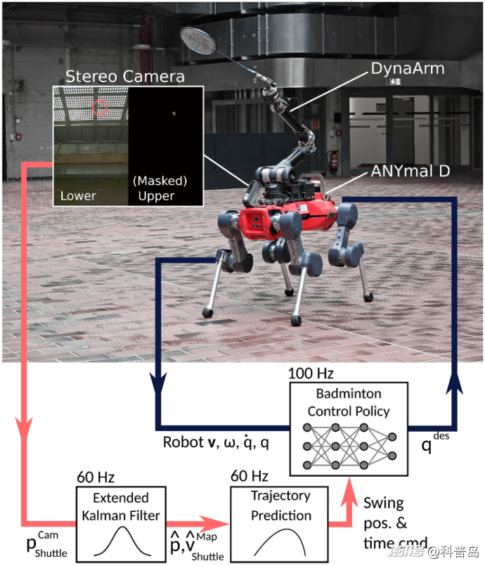 機器狗系統概覽。機械臂由四足底座和動態機械臂組成,另外還額外安裝了一個立體攝像頭。機器人控制器系統接收在相機坐標系中計算出的羽毛球位置,預測攔截位置,并將其與機器人本體感知數據一起輸入強化學習(RL)策略。該策略通過生成關節指令來控制機器人的全部18個驅動裝置。