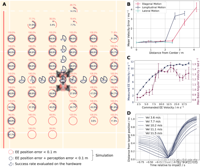 經過嚴苛的訓練和精心的設計,ANYmal-D機器狗在羽毛球場上展現出了令人驚嘆的實力。它不僅能夠準確地預測羽毛球的軌跡,還能以高達每秒12.06米的速度揮拍,并且在挑戰條件下仍能保持80%以上的擊球成功率。更令人稱奇的是,它還能與人類玩家進行長達10拍以上的連續對打,這在機器人領域是一個里程碑式的成就。