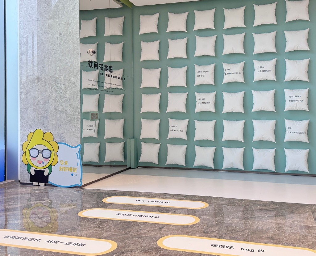 展覽雖以輕松互動為形式,背后卻是對“健康與創新并重”理念的嚴肅回應。通過“識別”“療愈”“賦能”三大主題板塊的設置,引導觀眾在參與中重新思考心理健康與創造力之間的關系,重塑社會支持系統的可能。在"識別"展區,"枕間校準器"以枕頭為載體,探討睡眠如何影響情緒識別與決策能力,傳遞"睡眠是高效創新的底層代碼"這一理念;"療愈"展區則呈現了插畫師貓九的系列作品,以細膩溫暖的筆觸為觀眾提供"暫停"與"覺察"的空間,幫助大腦從"解決問題"模式切換至"感受存在"模式;而“賦能”展區則為參觀者提供了心理補給與正向激勵,希望能夠引導科創人在高壓環境中依然保持內在動力。