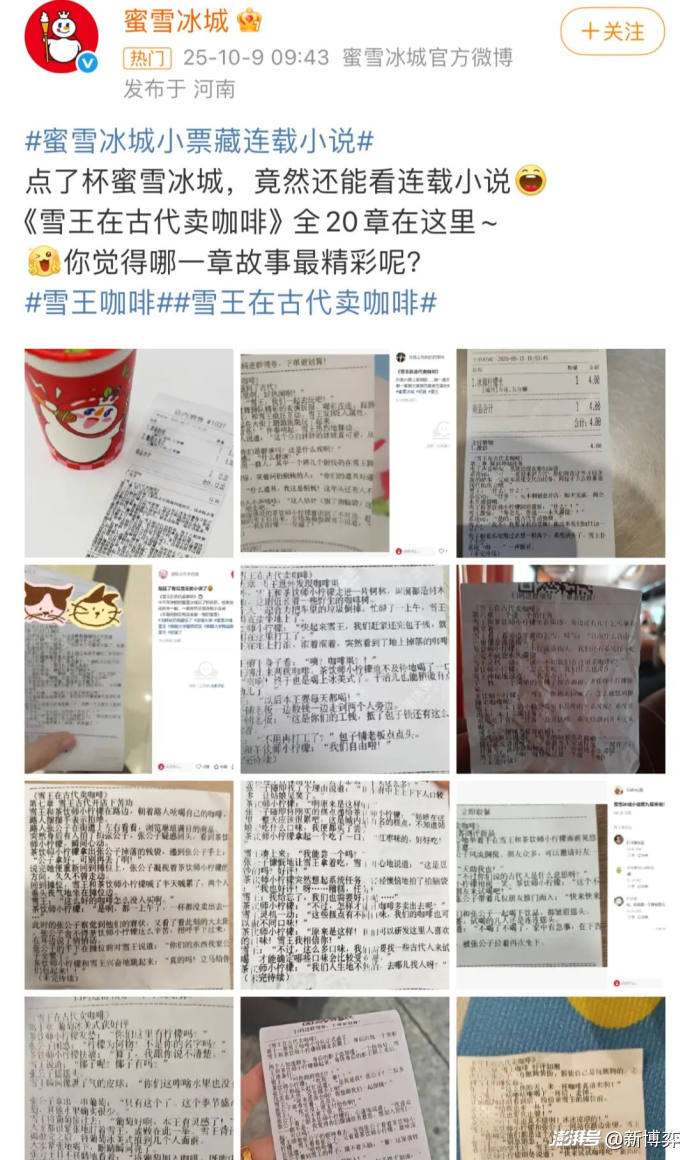 相比于豪擲千金的聯名,如今的“小票文學”無疑可以視作一眾新茶飲品牌在輕量化營銷與輕量化創意上的新探索。AI技術力不斷迭代的當下,批量制造《雪王在古代賣咖啡》《白月光》此類小體量連載小說對品牌而言并不是什么難事,品牌付出最多的成本,或許就是小票加長后所需的熱敏紙材料更多了些,但它帶給消費者的驚喜遠超于此。