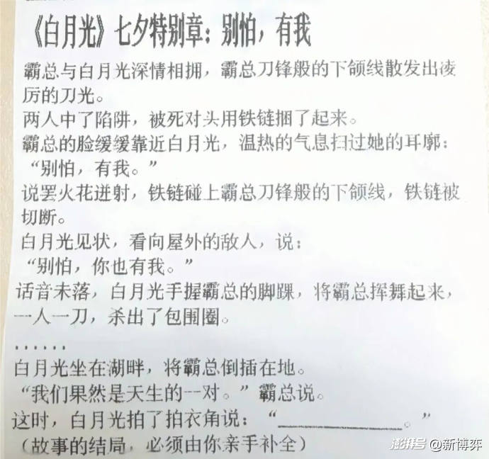 “霸總與白月光深情相擁,霸總刀鋒般的下頜線散發出凌厲的刀光。兩人中了陷阱,被死對頭用鐵鏈捆了起來,霸總的臉緩緩靠近白月光,溫熱的氣息掃過她的耳廓:別怕,有我。說罷火花迸射,鐵鏈碰上霸總刀鋒般的下頜線,鐵鏈被切斷。”