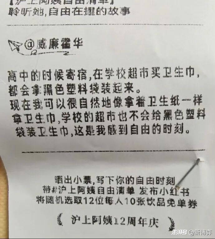 相比于K22酸奶草莓和茶顏悅色,滬上阿姨的“小票文學”明顯高明了許多。七月份,迎來十二周年慶的滬上阿姨推出“她,自由在握”主題活動,其中便包含在點餐小票上“聆聽她,自由在握的故事”這一創意營銷,品牌將消費者分享的“自由時刻”打印在了小票上,并在小紅書發起了#曬小票,寫下你的自由時刻#的話題活動,推動社區討論裂變。