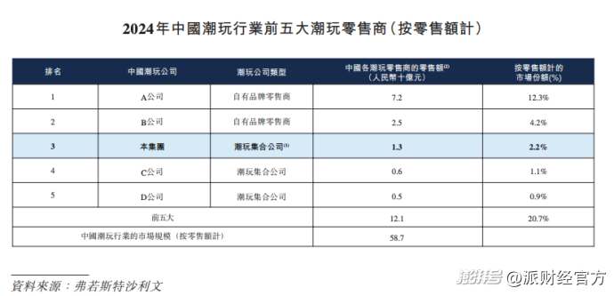 從行業市占率角度,按2024年銷售額計算,TOP TOY是中國第三大潮玩零售商,市占率2.2%,第一名則是泡泡瑪特,市占率達到12.3%,第二則是樂高,市占率4.2%。