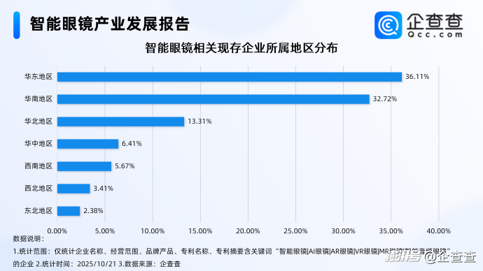 企查查數據顯示,截至10月21日,國內智能眼鏡相關企業現存量達5682家,主要分布在華東、華南兩地,分別占比36.11%、32.72%。分布在華北地區的相關企業占比達13.31%,位于華中、西南、西北、東北地區的智能眼鏡相關企業,占比均不到10%。